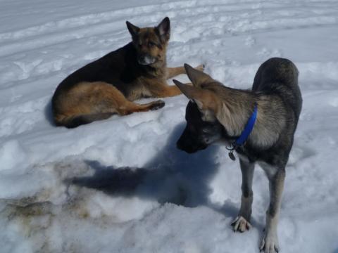 Hallo Fam. Rupp ein paar neue Fotos vom Energiebündel Bungee. Er hat neben dem Wasser nun noch was viel schöneres entdeckt; seinen ersten Schnee. Zuerst war er ein bisschen zaghaft, hat aber schnell von Lobo gelernt, dass man herrlich damit spielen kann und es angenehm kühl ist. Auch sonst entwickelt er sich sehr gut, manchmal ein wenig stur, aber meistens ist er mit Interesse bei den diversen Lernübungen dabei. Er ist sehr verspielt, egal ob mit anderen Hunden oder mit Spielzeug; Hauptsache herumtoben. Läuft problemlos (ohne Angst) durch grosse Menschenmengen, mag jedoch nicht von jedermann gestreichelt werden, ihm bekannte Menschen werden dagegen überschwenglich begrüsst. Er hat jetzt eine Schulterhöhe von 57 cm und wiegt knapp 19 kg. Liebe Grüsse aus dem Berner SeelandEintrag 01