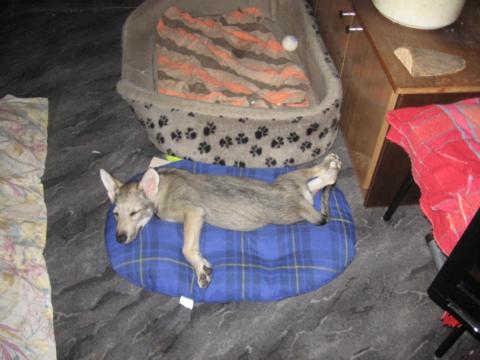 Hallo liebe Familie Rupp, heute möchte ich mich nun mal melden. Inzwischen ist bei und der Alttagstrott wieder eingezogen und Hilary übt sich nun im Alleinsein (mit den anderen Hunden). Aber Hilary macht es schon ganz gut und die Wiedersehensfreude ist riesig. Aber nun von Anfang an : ich weiß zwar nicht wo ich anfangen soll, Hilary ist so ein toller und lieber Hund, trotzdem war die erste Woche ganz schön schwer für unsere Kleine, alles neu , aber sie hat alles bis jetzt gut gemeistert. Wir waren viel spazieren mit den Hunden, um die nähere Umgebung kennen zu lernen (den Heimweg hat sie jetzt schon drauf) , viele Ausflüge haben wir gemacht, um uns an Menschen und andere Tiere zu gewöhnen, auch an Fahrradfahrer, Kinderwagen, lärmende Jugendliche usw., es gibt ja so viel Neues auf dieser Welt. Ich glaube am liebsten mag Hilary unsere so genannten Abenteuerwanderungen, wo man hier und da schnüffeln kann. Hilary kann mit und ohne Leine laufen und bleibt immer schön in der Nähe, auch wenn`s im Gebüsch herrlich ist. Im Haus ist auch alles ok . Sie kennt sich schon bestens aus. In der ersten Woche ist sie auch schon allein die Treppe hoch und runter, wir versuchen zwar immer, dass sie die Treppe nicht allein geht, aber meistens ist sie zu schnell, stubenrein ist sie fast, das pillern ist noch nicht so richtig zu stoppen, aber das große Geschäft erledigen wir draußen. Hilary macht sich ganz prima. Und eins macht sie besonders schön, sie schwimmt wie ein Fisch. Am Anfang war ihr das Wasser etwas unheimlich, man kann es nicht beißen, nicht festhalten und nicht drauf laufen, aber sie hat soviel Vertrauen, das sie uns beim zweiten Mal Baden gleich ins Wasser hinterher kam, worauf mein Mann ganz stolz ist, so eine tolle Wasserratte zu haben. Ihr seht, wir sind des Lobes voll über unseren Hund und es war die richtige Wahl, sie ist großartig und was sie noch nicht kann, dass lernt sie. Apropos lernen, ihr habt recht gehabt, kein Hund lernt so schnell wie Diese, es ist wirklich verblüffend, wie schnell alles bei ihr geht. Auch das wachsen geht bei ihr schnell, sie hat ihr Gewicht verdoppelt und gestreckt hat sie sich auch. Unser Tierarzt war auch sehr zufrieden, alles im grünen Bereich. Hilary hat mit keiner Wimper gezuckt bei der Untersuchung oder der Impfung. Und so einen Hund hatte unser Tierarzt auch noch nicht, genau wie unsere Reptilien, er lernt auch bei uns noch was Neues dazu. Die Entwurmung hat Hilary auch schön mit Leberwurst geschluckt. Verfressen ist Hilary aber dann schon. Eine Frage haben wir noch und zwar zu den Wolfskrallen. Müssen die so sein oder nicht. Aber das eilt nicht. So nun aber erstmal Schluss für heute, anbei ein paar Bilder von der Ankunft hier zu Hause, auf unserer Hunderunde die Wiesen und beim Baden. Es folgen bestimmt noch mehr.